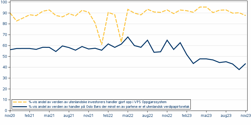 Statistikken viser den prosentvise andel av verdien av handler på Oslo Børs der minst en av partene er et utenlandsk verdipapirforetak, og den prosentvise andel av verdien av utenlandske investorers handler er gjort opp i VPS' oppgjørssystem. Oppdateres hver måned.